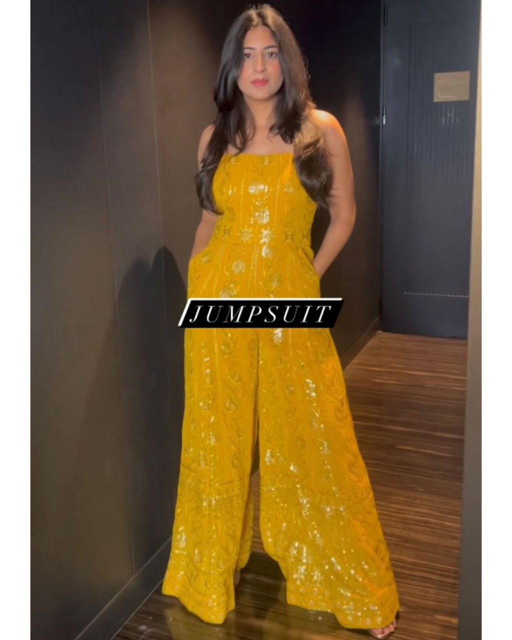 Beautiful Mustard Yellow Pure Georgette Embroidery Work Jumpsuit