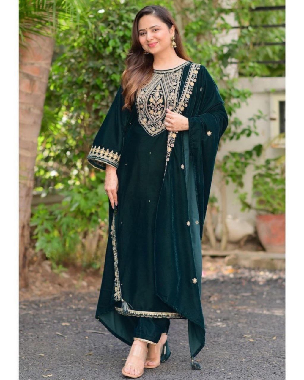 Casual Dark Green Micro Velvet Embroidery Work Pakistani Suit With Dupatta