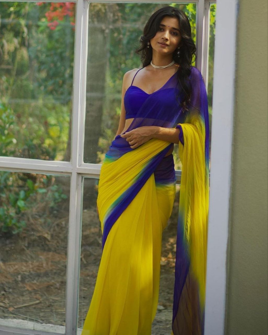 Be the first to review “Casual Yellow-Blue Pure Georgette Shade Printed Saree With Blouse” Cancel reply