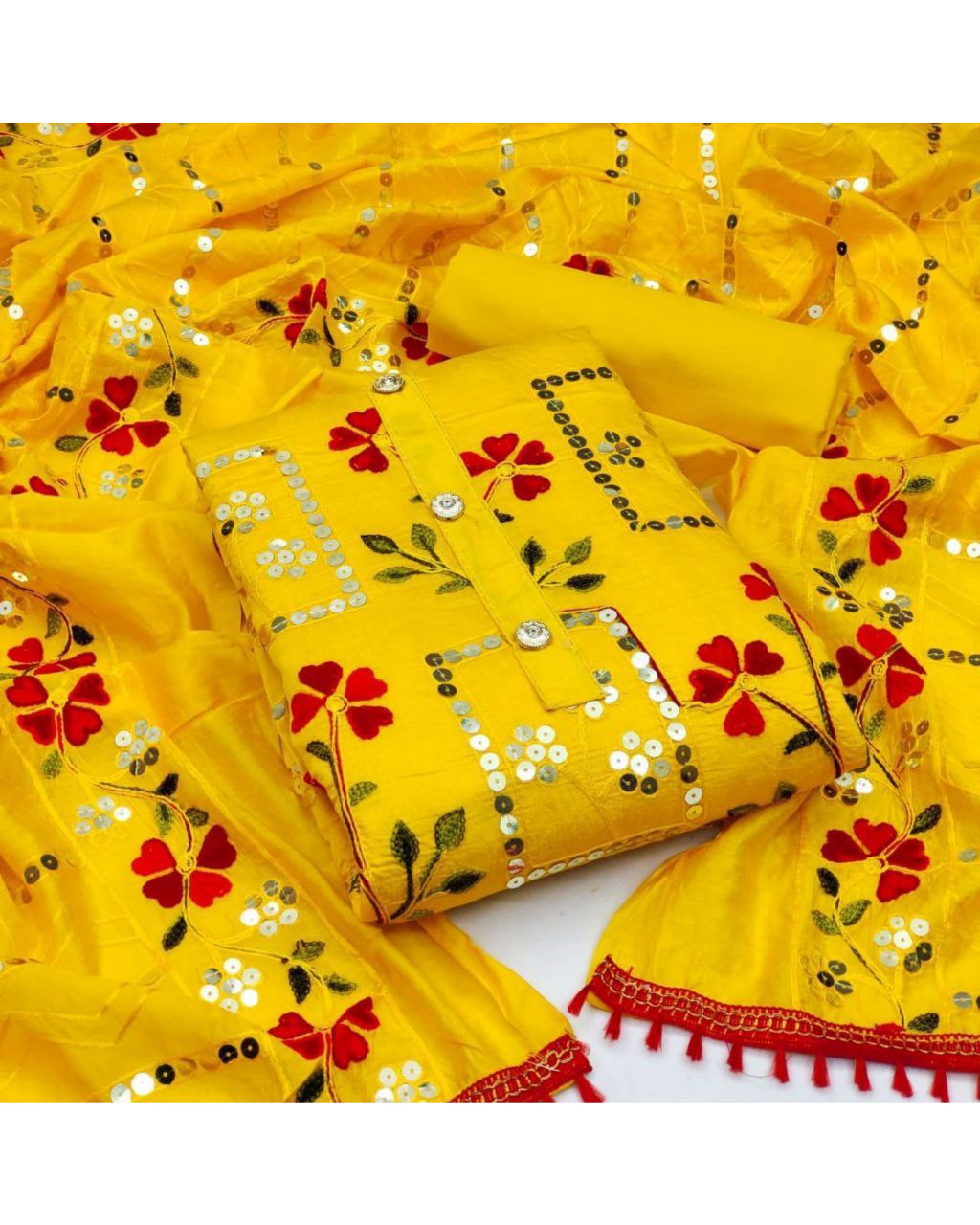 Be the first to review “Casual Yellow Sequence Work Chanderi Salwar Suit With Dupatta” Cancel reply