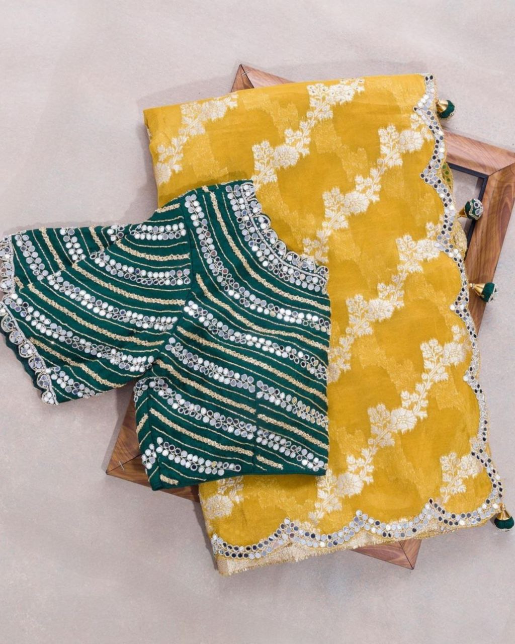 Be the first to review “Demanding Yellow Embroidery Cut Work Border Saree With Green Blouse” Cancel reply